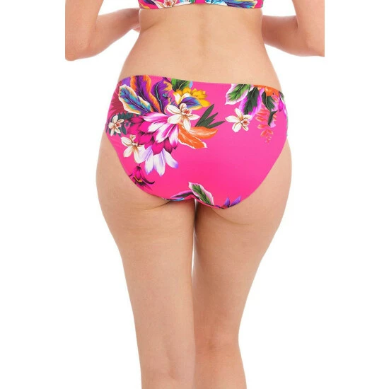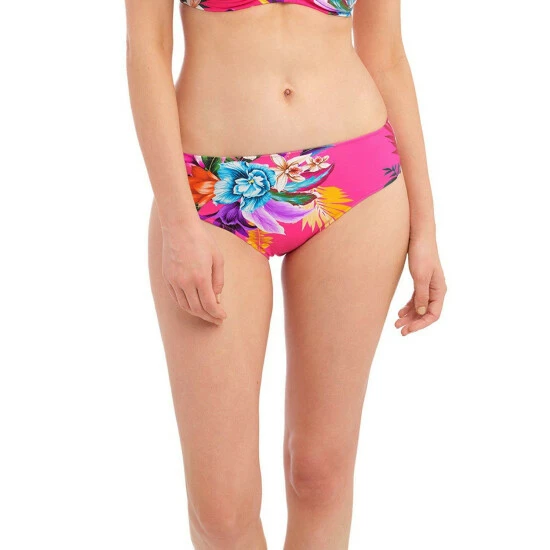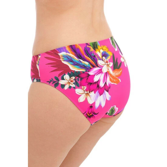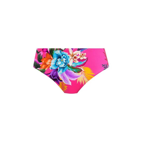 Halkidiki features a botanical print design, with a rich palette of golden yellows, sky blue and violet tones, contrasting against the fuchsia pink base. The Mid Rise Bikini Brief offers medium coverage. Fully lined. Made from 83% Nylon/Polyamide – 17% Elastane.