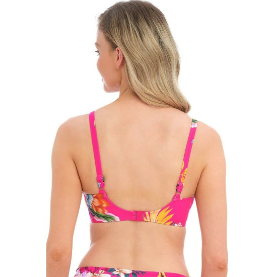 Halkidiki features a botanical print design, with a rich palette of golden yellows, sky blue and violet tones, contrasting against the fuchsia pink base. The Full Cup Bikini Top has gathered cups which flatters all bust shapes. Fuller coverage cups with concealed side sling for forward profile. Powernet lined wings for support and anchorage. Fixed fully adjustable shoulder straps. Made from 80% Nylon/Polyamide – 20% Elastane.