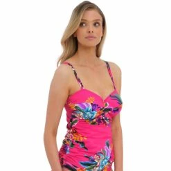 Halkidiki features a botanical print design, with a rich palette of golden yellows, sky blue and violet tones, contrasting against the fuchsia pink base. The Tankini has a twist front detail which gives a flattering sweetheart neckline. Lightly padded foam cups for support and a smooth rounded shape. Powernet lined wings for support and anchorage. Concealed underwire for support. Adjustable tie sides for variation of body length. Ruched body to flatter the tummy area. Concealed inner hook and eye for support and control. Fixed fully adjustable shoulder straps. Made from 83% Nylon/Polyamide – 17% Elastane.