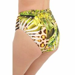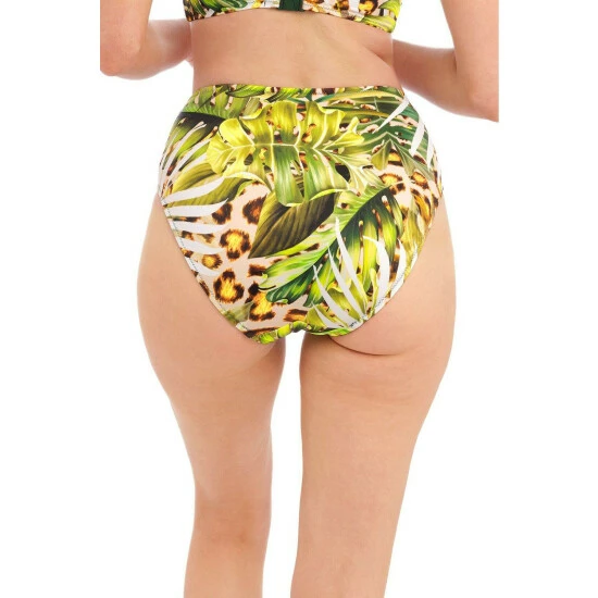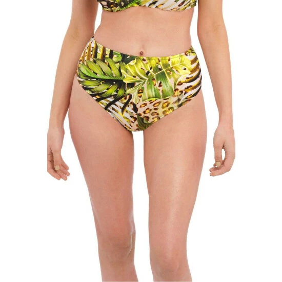 Kabini Oasis offers a camouflaged print behind bold green leaves, silhouetted with white palm fronds. The High Waist Bikini Brief features a flattering high rise coverage and higher cut leg. Fully lined.