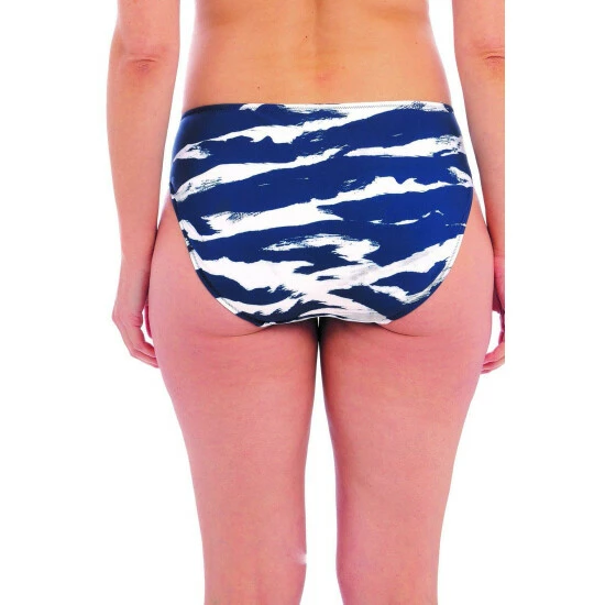 Lindos features a large scale animal print in inky tones on an off-white base. The Mid-Rise Bikini brief is fully lined with a flattering cut on the leg and good bottom coverage.