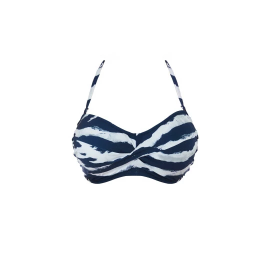 Lindos features a large scale animal print in inky tones on an off-white base. The Bandeau Bikini Top has concealed under-wires and lightly padded foam cups for support and shaping while the Powernet lined wings provide good anchorage. Flattering twist-front detail. Fully detachable scarf-tie straps are included.