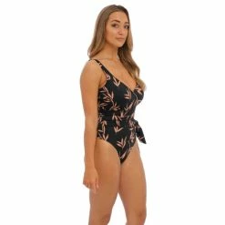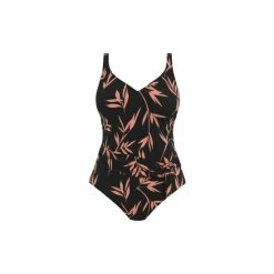 With an oriental inspiration, Luna Bay features silhouetted bamboo leaves in earthy tones of mink on a black ground. This Swimsuit has a flattering deep V-neckline and concealed underwire for support. Pared back construction for a fit that feels more flexible. Higher leg and lower scoop back for reduced coverage and ease of wear. Built up shoulder straps. Front lined. Wide belt with coloured tortoiseshell design ring detail. Made from 82% Nylon/Polyamide – 18% Elastane.